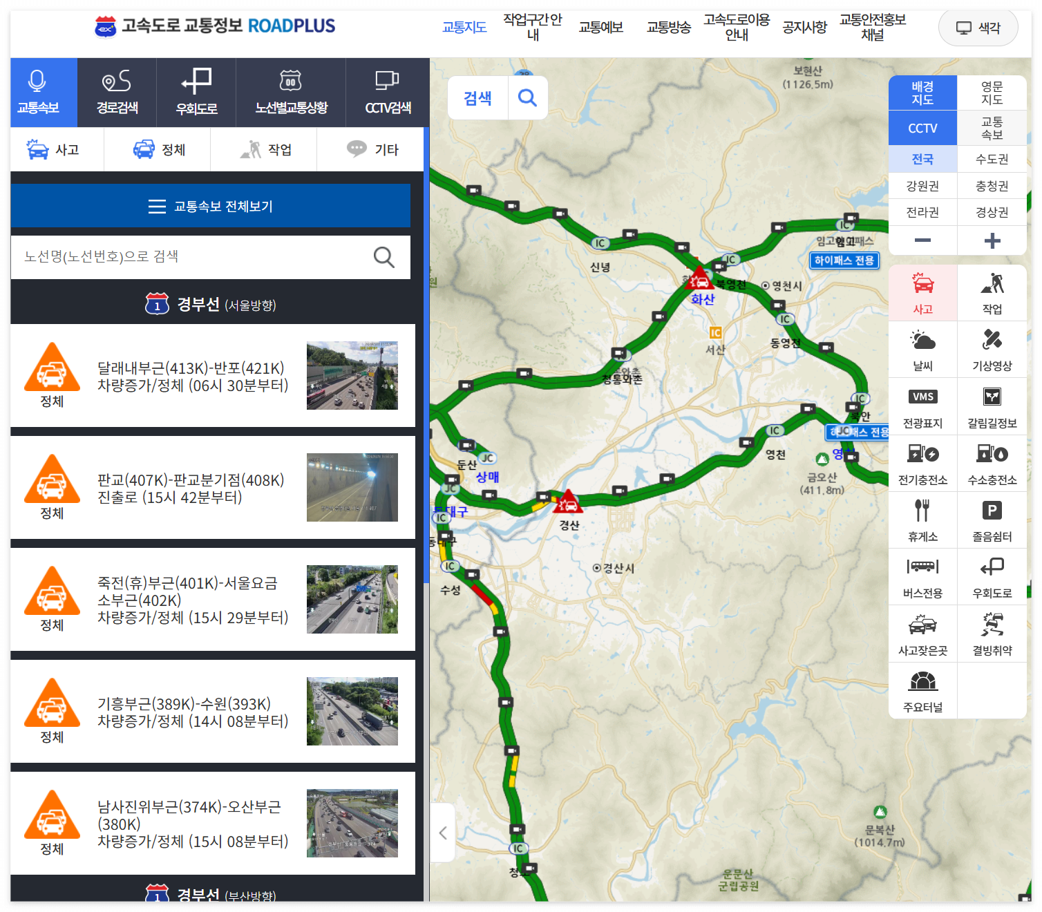 ▶왼쪽에 보시면 교통속보, 경로검색, 우회도로, 노선별교통상황, 그리고 CCTV검색 메뉴얼을 확인 할 수 있습니다. 각각 기능을 활용하시면 됩니다.