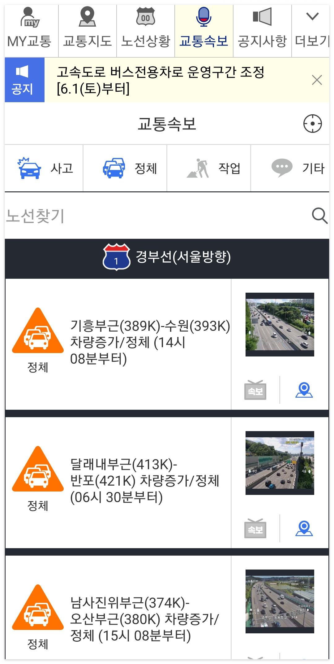 🔹고속도로 사고, 정체, 작업 등의 교통속보와 해당 구간의 CCTV영상, 교통방송을 확인 할 수 있습니다.