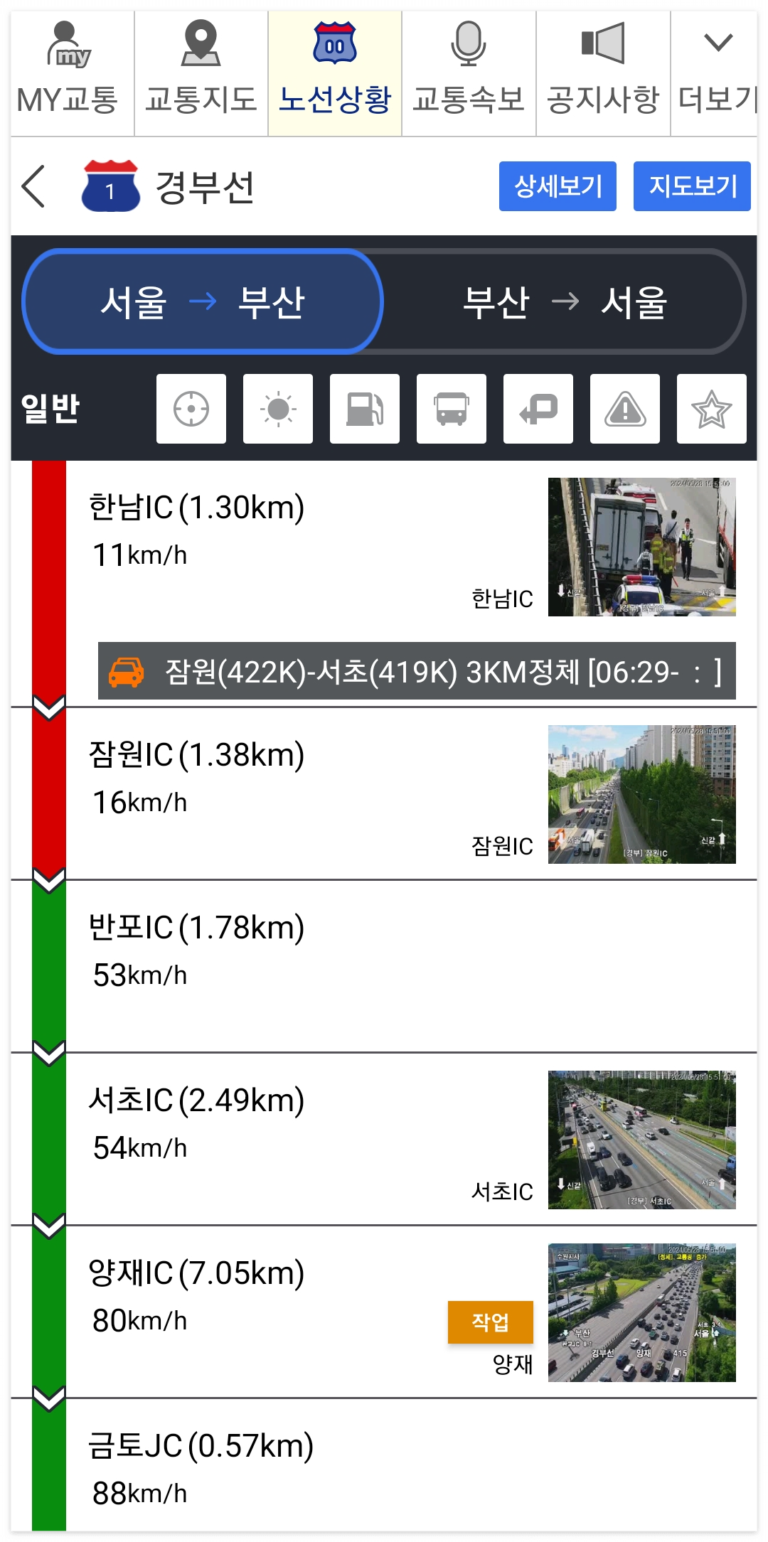 ▶"노선상황"을 선택하시면 구간별 정체구간, 소통구간을 확일 할 수 있습니다.