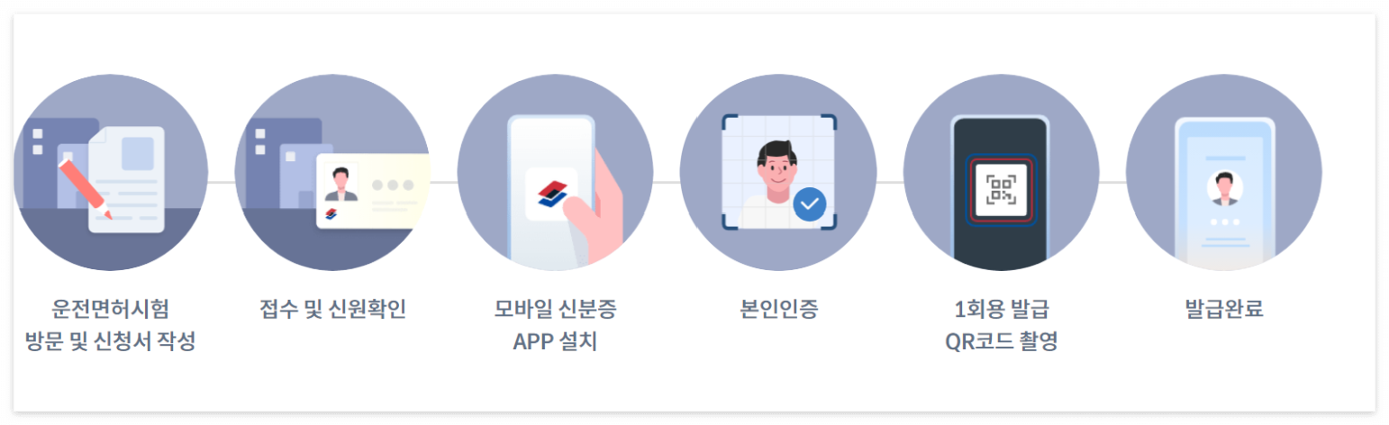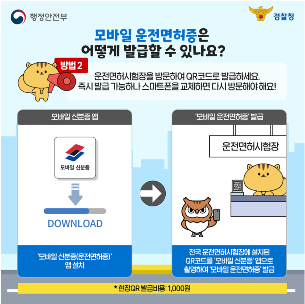 모바일 신분증을 만드는 두 번째 방법입니다. 이를 위해 먼저 주변의 운전면허시험장을 방문해야 합니다. 운전면허증을 지참하고 방문하시면 앞서 설치한 모바일 신분증 앱을 사용하여 본인인증을 진행하고 1회용 발급 QR코드를 받게 됩니다. 이 QR코드를 촬영하여 즉시 모바일 신분증을 발급받을 수 있습니다.