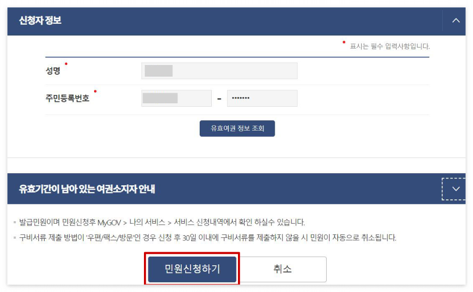 ✅신청자 정보에서 유효여권 정보조회를 누르고 민원신청하기를 누릅니다.