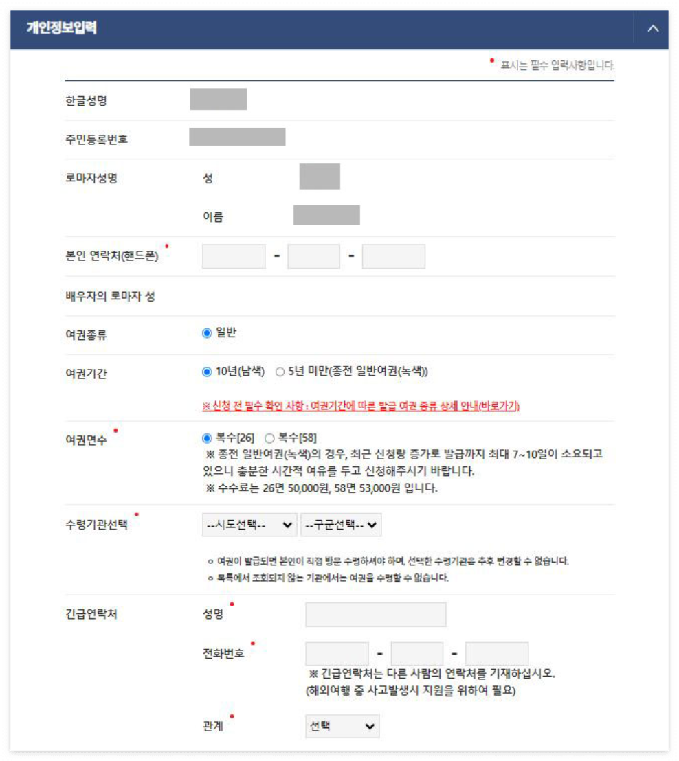 ✅이용약관 동의, 개인정보를 입력하고 여권기간, 여권면수를 선택하여 신청서를 작성합니다.
