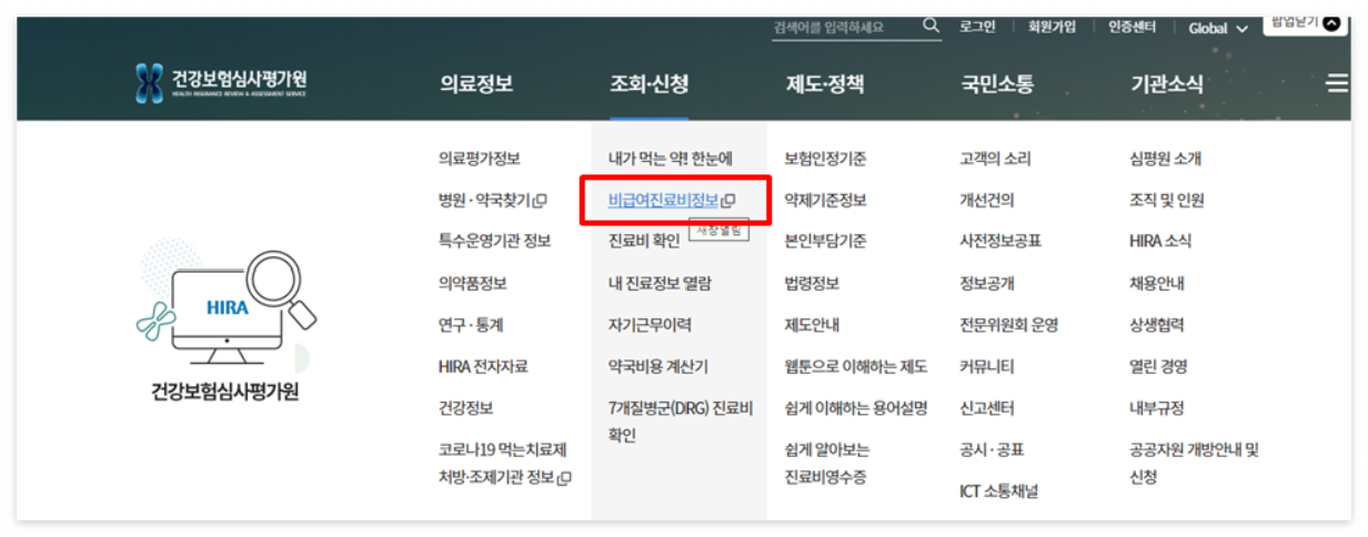 1.메인 홈에서 '비급여 진료비 정보'를 클릭합니다.