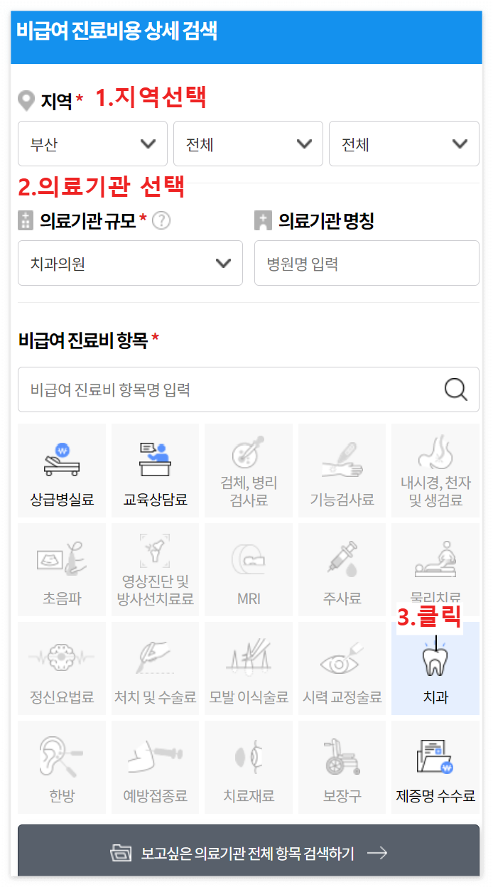 2.살고있는 지역 입력 > 의료기관 규모 설정 > 비급여 진료비 항목(임플란트) > 선택항목 검색하시면 지역치과병원들이 나열되며 치료 상세내역과 그에 따른 비용을 조회하실 수 있습니다.